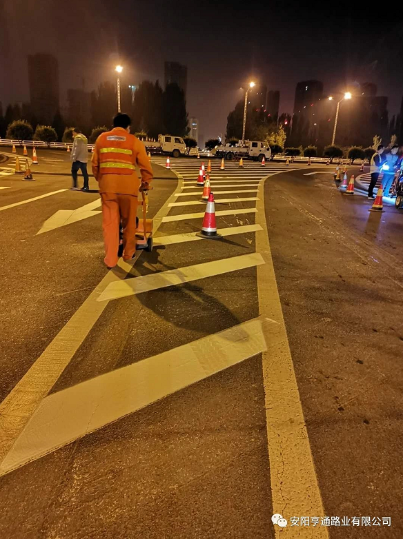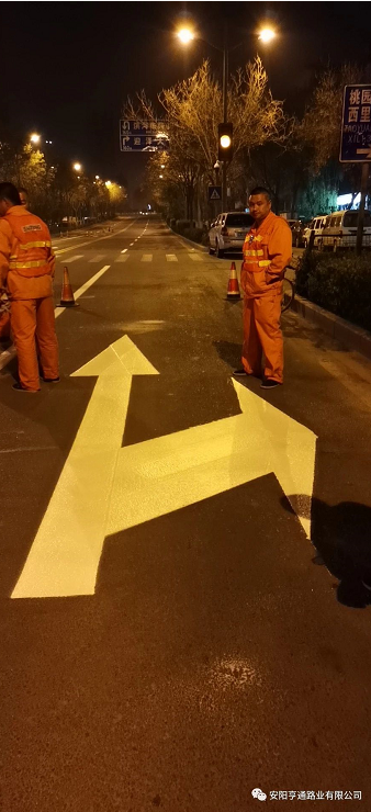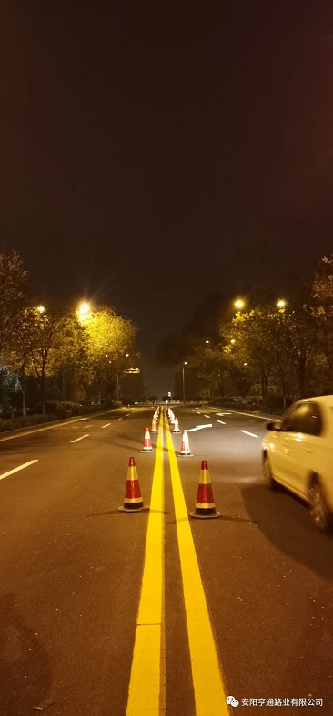 此次標(biāo)線施工,為不影響市政公路通行,均在夜間車流量較少的時候進行施工,在施工安全第 一的前提下,亨通的同事們保質(zhì)保量的用高 效率完成了標(biāo)線試驗段施工,該試驗段被項目部評為施工模范。